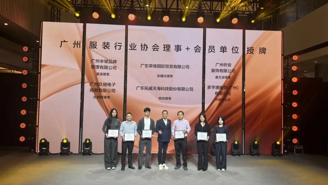During the membership plaque-awarding ceremony of the Guangzhou Garment Industry Association, Guangdong Rongyuan International Trade Co., Ltd., acting as a Council Member Unit, proudly accepted the association's official plaque alongside other distinguished peer enterprises.